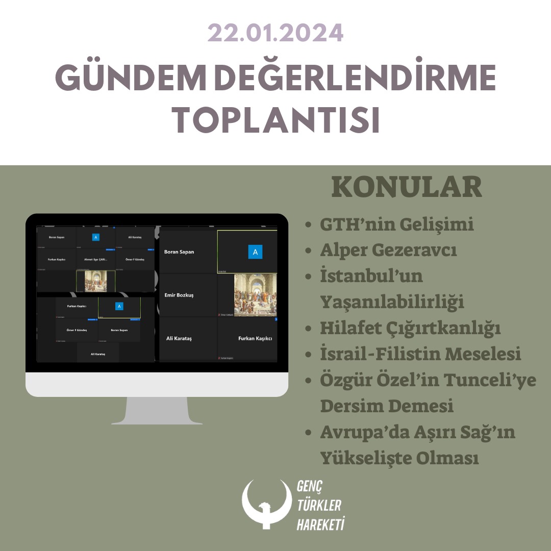 22.01.2024 tarihinde Genç Türk arkadaşlarımızla gündemdeki olayları konuştuğumuz bir “Gündem Değerlendirme Toplantısı” yaptık. Türk gençleri olarak farklı bakış açılarıyla gündemdeki olayları değerlen...
